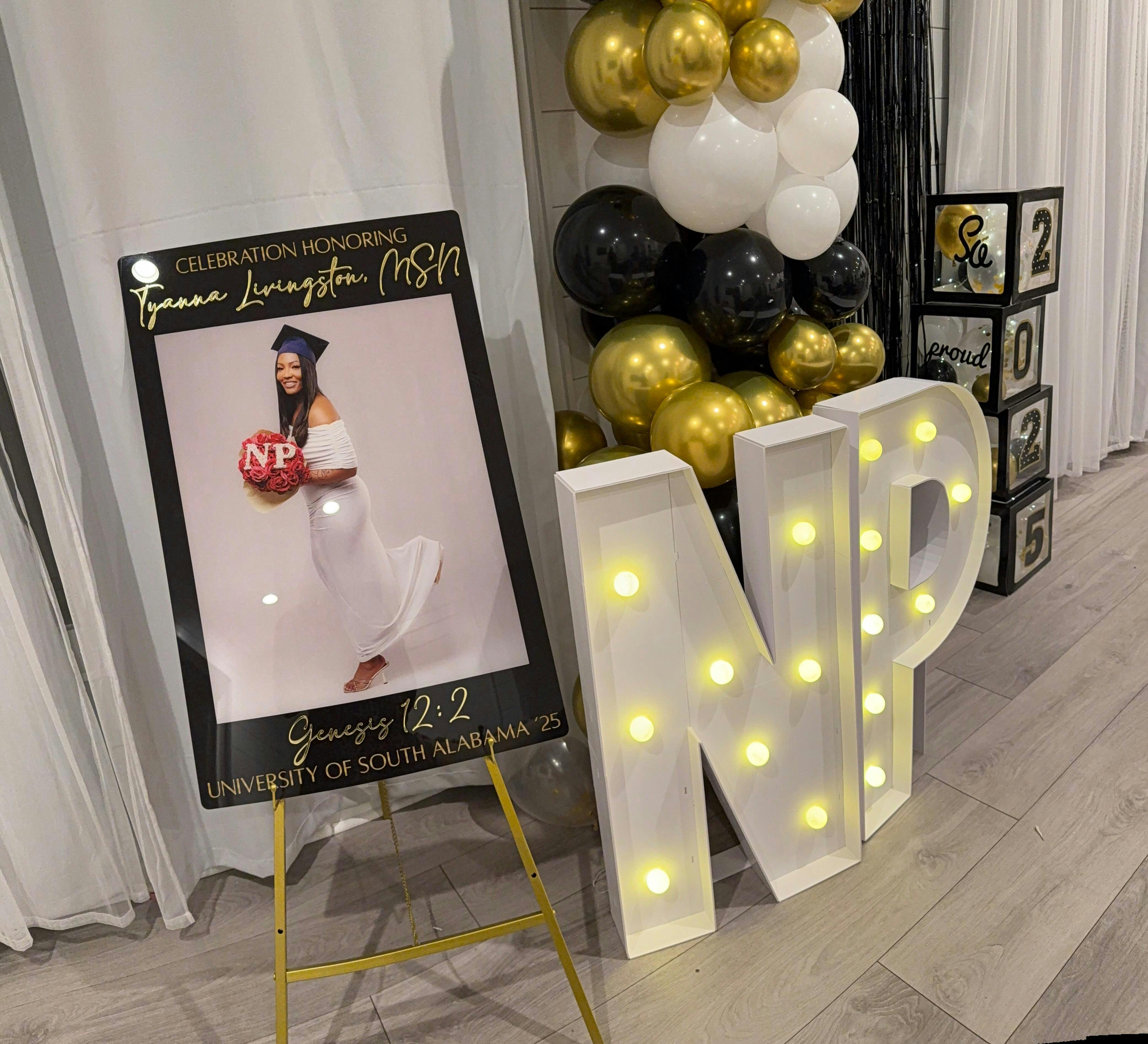 Celebrate your graduate's special day with our stunning Photo Welcome Sign for Graduation. This versatile piece is fully customizable and includes a beautiful printed photo of your graduate, making it a unique and personal touch to your celebration.
